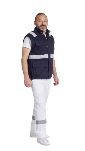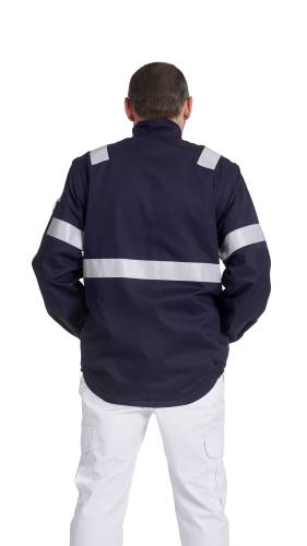 Blouson ambulancier 65% polyester, 35% coton 245 g/m². Fermeture par zip recouvert d'une patte pressions, 5 poches dont 3 à rabat fermées par velcro, 1 poche stylo sur manche gauche, doublure polaire amovible, manches démontables, dos liquette, renforts coude, poignets fermés par pressions, bande rétro-réfléchissantes de 30 mm, longueur 80 cm.