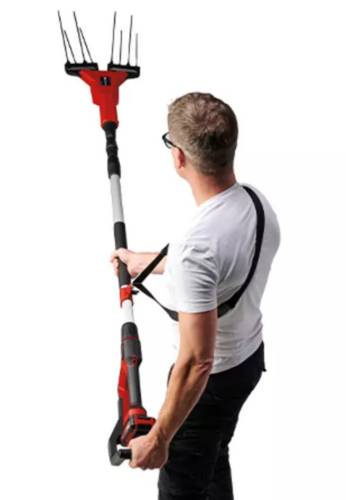 Cet appareil léger et maniable permet de faire tomber tous les fruits ou olives grâce à la puissance d’une batterie. Le secoueur d’olives/de fruits sans fil fait partie de la gamme Power X-Change, dans laquelle les batteries, chargeurs et appareils peuvent être combinés en toute flexibilité. Le râteau collecteur opère un mouvement latéral constant dans les branches et couvre une largeur utile allant de 28 à 53 cm. Les 8 dents en carbone solides d'une longueur de 31 cm font tomber les fruits ou olives des branches. Une molette rotative permet de régler sa vitesse de déplacement. Chaque dent en carbone se remplace facilement. Pour atteindre sans difficulté les branches très hautes, la longueur totale de cet appareil électrique peut être réglée entre 220 et 310 cm grâce à la fonction télescopique. La poignée auxiliaire arrière facilite en outre l’accès aux branches hautes. Associées à la fonction de marche continue, les surfaces Softgrip, qui assurent une manipulation confortable, soulagent l’effort lors d’une utilisation prolongée. La sangle de transport réglable permet une répartition optimale du poids. Un support mural très pratique est inclus de série pour un rangement peu encombrant de l’appareil. Moteur à charbon. Batterie et chargeur non inclus (accessoires disponibles séparément, notamment dans le Starter Kit très pratique).