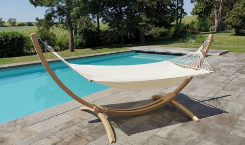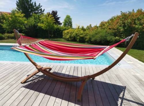 Hamac, toile avec quadruples coutures en Jobekcord (polypropylène), 167g/m². Barres en bois en Couratari certifié FSC 100%. Support bois en bois d'Épicéa de Scandinavie lamellé collé, certifié FSC Mix. Poids 18kg. Charge maxi 120kg. Garantie 2 ans.