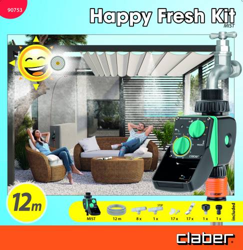 Kit de brumisation idéal pour rafraîchir les espaces à l'extérieur pendant les chaudes journées d'été. Le kit (composé de 12 m de tuyau, 9 micro-nébuliseurs, raccords et clips de fixation) peut être facilement accroché à des stores, des tonnelles et des parasols et raccordé au robinet (moyennant rallonge de raccord non fournie). Les micro-brumisateurs, avec buses en laiton, vaporisent dans l'air de microscopiques gouttes d'eau qui permettent de refroidir l'espace ambiant jusqu'à 6 degrés en moins. Le kit comprend également le programmateur à pile AquaunoMist, qui active de manière automatique et à des intervalles réguliers le système de rafraîchissement. Pression de fonctionnement du kit: 2-6 bar.