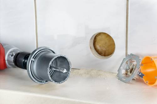 Set, 6 pièces, scies cloches avec grain de carbure de tungstène, poignée de tube de précision avec grain spécial de carbure de tungstène, brasée à haute température, pour béton cellulaire, maçonnerie, carrelage, céramique, pierre naturelle, panneaux légers, plaques de plâtre et plastique, pour les travaux d’installation, tels que l’installation de douilles et de boîtes de jonction et la pose de tuyaux. Ø de tige de 9mm.