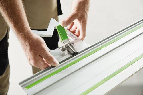 Angle droit garanti, à chaque instant. 90°, ni plus ni moins. La butée monobloc en aluminium fraisé garantit une coupe à l'équerre précise et répétable sans rajustage. Grâce au système de serrage rapide, la butée angulaire s'installe en un tour de main sur le rail de guidage et se transforme, en combinaison avec une scie circulaire portative et une table de sciage et de travail, en scie à panneaux mobile. Butée monobloc en aluminium fraisé par CNC pour une coupe à 90° précise et répétable. Installation simple et positionnement entièrement automatique. Long bord d'appui facilitant le positionnement sur tous les chants de la pièce. Les encoches sur l'avant et l'arrière permettent d'installer des serre-joints FS. Pour la découpe précise de panneaux en combinaison avec un rail de guidage et une scie circulaire portative. Pour la découpe à 90° précise et répétable de panneaux, sans rajustage. Positionnement entièrement automatique grâce à la butée monobloc en aluminium fraisé. Assemblage simple et rapide sur le rail de guidage au moyen du levier de serrage rapide.