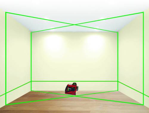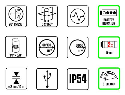 Projette 3 plans laser à 360°: un plan horizontal et deux plans verticaux à 90 ° les uns des autres. 4 équerrages aux murs. 2 croix, une au plafond et une sur le sol externe à la base de la structure pour le fil à plomb toujours visible. Positionnement facile au plafond (< 2 cm). Utilisation intérieure et extérieure (avec récepteur non inclus). Clignotement automatique du laser et avertissement sonore si l’appareil est hors de la plage d’auto-nivellement. Système de blocage intégrée pour éviter les vibrations lors du transport, possibilité de projeter les plans laser également dans une position inclinée fixe. Forme compacte, revêtement en caoutchouc antidérapant pare-chocs. Pile rechargeable Li-ion pour une longue durée ainsi qu'une pile de rechange et un chargeur pour la charge externe. Port USB-C intégré à l'instrument. Indicateur LED de charge de la batterie. Télécommande. Support mural magnétique. IP54. Rechargeable par USB.
