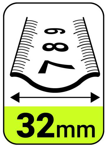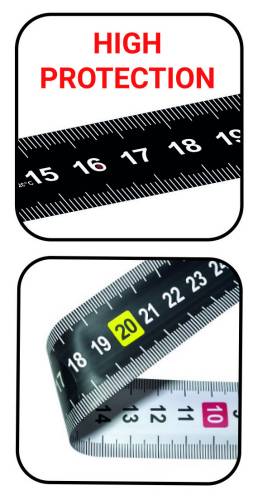 Boîtier en ABS caoutchouté résistant aux chocs. Ruban laqué : Numérotation horizontale noire à l'avant avec décimales jaunes à haute visibilité Numérotation verticale blanche à l'arrière avec décimales rouges. Ruban enduit de nylon avec couverture supplémentaire sur les 20 premiers centimètres pour une protection augmentée. Forme spéciale en W pour une plus grande extension au-delà de 3,5m.