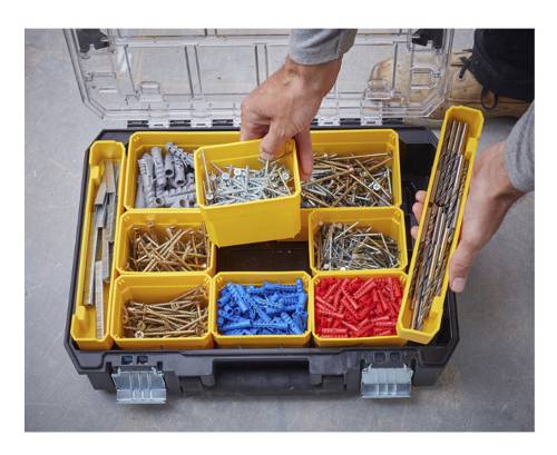 Compatible avec tous les éléments TSTAK pour créer votre solution de rangement personnalisée ! Plus compact avec une réduction de la hauteur de l'organiseur tout en maximisant la possibilité de rangement : 10 compartiments amovibles (vs 7 pour le standard). Idéal pour le stockage des vis, écrous ou petits accessoires. Couvercle transparent en polycarbonate avec rainures pour maintenir les godets en place lors du transport. Attaches et charnières métal. Large poignée bi-matière ergonomique. S’adapte et se fixe facilement aux autres modules grâce aux clips latéraux. Capacité de 7,8 litres.