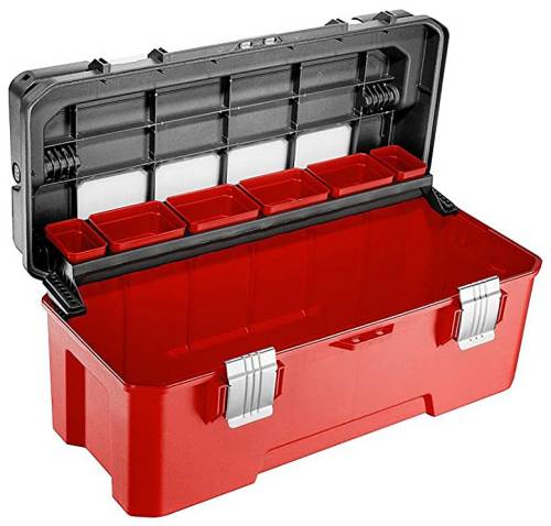 Structure polypropylène haute résistance aux chocs et aux solvants. Larges attaches métalliques anticorrosion. Joints d’étanchéité sous le couvercle. IP54. Longue poignée aluminium pour une meilleure prise : plus confortable, plus facile à soulever et à transporter. Couvercle ajouré pour permettre de visualiser le contenu des godets sans ouvrir la boîte à outils avec son système cantilever, elles offrent une station de travail à 2 niveaux (un plateau coulissant avec des godets amovibles de différentes tailles pour visseries, boulons, petites pièces… et 2 compartiments porte-embouts et une boîte à outil pour stocker des pièces plus importantes telles que scie, niveau…). Possibilité de mettre un cadenas sur les attaches (non fourni) . Poids vide 3,15kg, charge maxi 35kg.