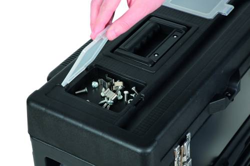 Chariot porte-outils à trois modules superposables avec roues de Ø 128mm. Structure en tôle d'acier et matière plastique. 3 modules séparables : 1 coffre supérieur, hauteur 222 mm, 1 module central, hauteur 168 mm, avec 2 tiroirs, hauteur 60 mm et 1 module inférieur, hauteur 332 mm, avec porte basculante, hauteur 280 mm, avec roues. Poignée télescopique réglable en 4 positions. Système de décrochage des modules avec accès aux différents compartiments porte-outils. Panier supérieur avec plateau porte-objets interne et 2 porte-outils incorporés dans le couvercle.