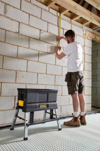 Une boîte à outils avec un marchepied d'une hauteur de 45 cm intégré dans le couvercle. La boîte se transforme en panier avec poignée rabattable sur le dessus et prises latérales. Elle se fixe sur le marchepied à l'aide d'une double attache qui fixe également le couvercle sur la boîte. Marchepied avec poignée ergonomique renforcée, marche en plastique et métal, pieds en aluminium et anti-dérapants avec boutons de blocage pour les sécuriser en position ouverte. Livré sans outils. Charge maxi sur marchepied : 150kg