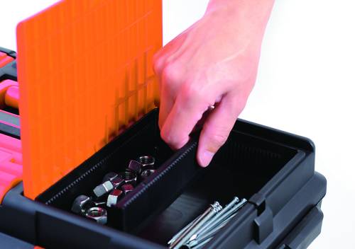 3 bacs de rangement intégrés dans le couvercle avec séparateurs réglables. 1 récipient interne avec séparateurs réglables. Livrée sans outils.