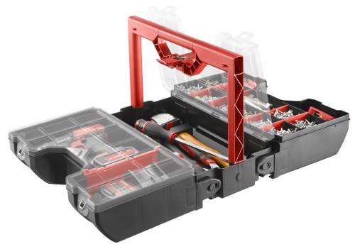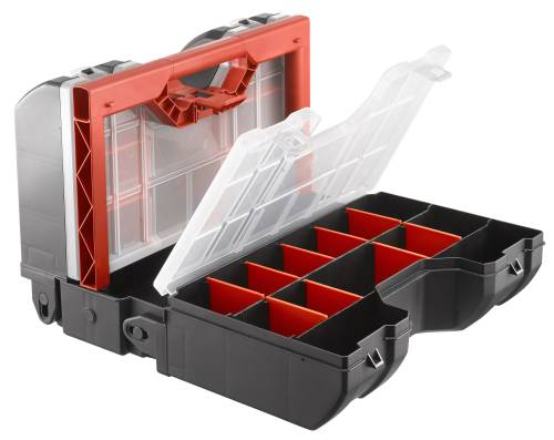Permet de ranger des pièces, des outils à main. Offre de multiples possibilités de compartimentage. Evite le mélange des pièces. Le grand compartiment central permet d’accueillir des outils à mains (tournevis, marteau...). Tout est instantanément visible et accessible. Nouvelle fermeture à ressort intégré, facilite l’ouverture et la fermeture.