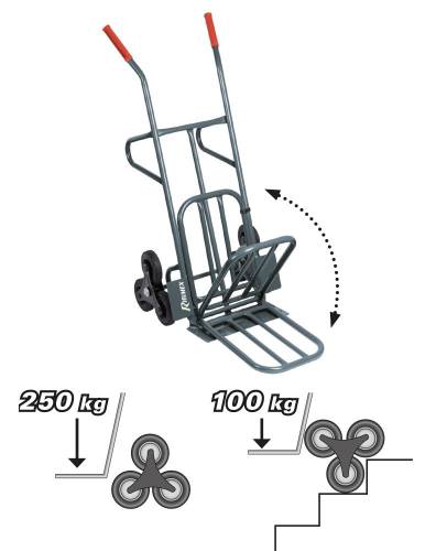 Idéal pour monter ou descendre les escaliers. Diable en métal peint époxy. Axe de roues et bavette renforcés. Équipé de 2 poignées en plastique moulé. Transport par basculement sur l’axe de roues. 3 roues en nylon Ø 140 mm par côté. Bavette rabattable 520 x 330 mm.