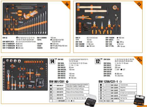 Servante 6 tiroirs avec 196 outils sur trois plateaux ( 1 plateau ''douilles et embouts 1/4 et 1/2'', 1 plateau ''pinces et martellerie'' et 1 plateau ''clés mixtes et tournevis''). Six tiroirs de 570x410mm montés sur glissières à billes de précision. 1 tiroir hauteur 140mm, 4 tiroirs hauteur 110mm et 1 tiroir hauteur 160mm. Fond des tiroirs protégé par un tapis en caoutchouc mousse. Table de travail en polypropylène. Quatre roues Ø 125mm : 2 fixes et 2 pivotantes (dont une avec frein). Verrouillage de sécurité centralisé frontal. Capacité de charge statique: 150 kg. Dimensions : 76x46x95mm