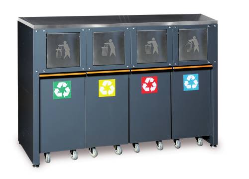 Créez votre propre station de recyclage dans l'atelier. La solution idéale pour la collecte sélective des déchets (verre, papier, plastique...). Structure en tôle solide complète avec 4 conteneurs à porte basculante pour collecter les déchets séparément. Chaque conteneur est équipé d'un panier de 25 L en plastique amovible et de 4 roues pivotantes Ø 60 mm. Kit de 4 autocollants colorés inclus dans le packaging. Équipé de pieds réglables verticalement.