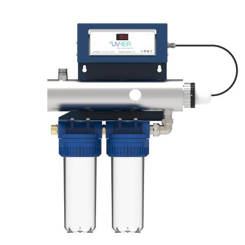 Pour potabilisation d’eau brute (forages, captages, puits...), sécurisation d’eau de pluie (usage sanitaire uniquement), sécurisation d’eau de réseau. Affichage digital, alarme visuelle et sonore. Chambre de traitement inox 316 L. Pression max 6 bars. Température de l’eau 0 à 40 °C. Regard pour cellule de contrôle. Raccordement en axe opposé. Gaine quartz fond bombé. Platine de fixation de construction métallique. Bloc ballast électronique. Lampe mono-culot 9 000 h. Leds vertes et rouges d’état de lampe. Décompte journalier et interrupteur de remise à zéro. Buzzer défaut lampe. Cordon d’alimentation 220 V+T.