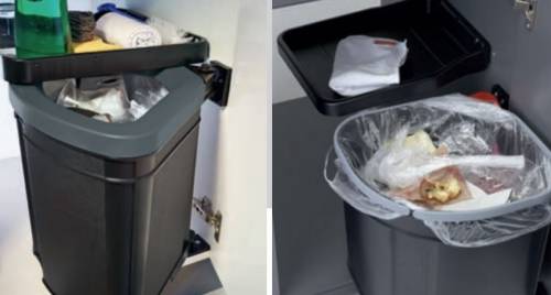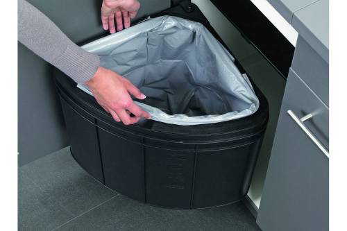 A fixer à l'intérieur du meuble (livré avec système de fixation). Pour meuble de 400 mm minimum. Les charnières de la porte doivent pouvoir s'ouvrir à 115° minimum (pour éviter tout problème d'extraction de poubelle). Ouverture automatique avec l'ouverture de la porte (triangle entraînant la poubelle). Fixation de la tablette sur un seul montant du meuble. Dimensions : 358x341x419mm