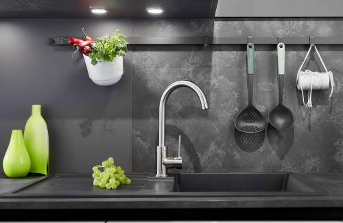 Corps laiton, poignée métallique. Bec haut mobile. Cartouche céramique Ø 35 mm. Aérateur mousseur F22. 2 flexibles d’alimentation inox F3/8''. Fixation facile sans outillage par vissage du pommeau. Garantie 5 ans.