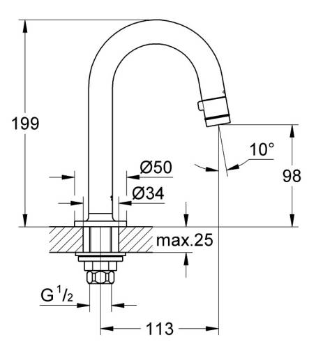 Idéal pour les petits espaces de la maison, comme les toilettes. Son design est volontairement sobre et lisse. Bec C. Ouverture et fermeture par le mousseur. Tête céramique. Avec taraudage 10,5mm. Finition Longue Durée. Économie d’eau Consommation d'eau réduite, jet parfait. Débit maximum à 3 bars : 5L/min. Saillie du bec deverseur 113 mm.