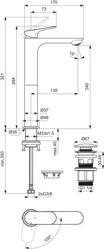 Bec fixe avec aérateur intégré. Aérateur Coin Slot avec limiteur de débit 5 L/min. Ouverture en eau froide en position centrale : Technologie Blue Start. Cartouche Firmaflow® Ø 28mm avec limiteur de température intégré. Indicateurs rouge/bleu imprimés sur la manette. Poignée et rosace en métal. Système de fixation par écrou. Bonde clic-clac chromé. Flexibles d'alimentation sertis anti-torsion : PEX 3/8" femelles - 350mm. Dimensions 321x170x48mm. Hauteur sous aérateur 240mm. Projection 135mm.