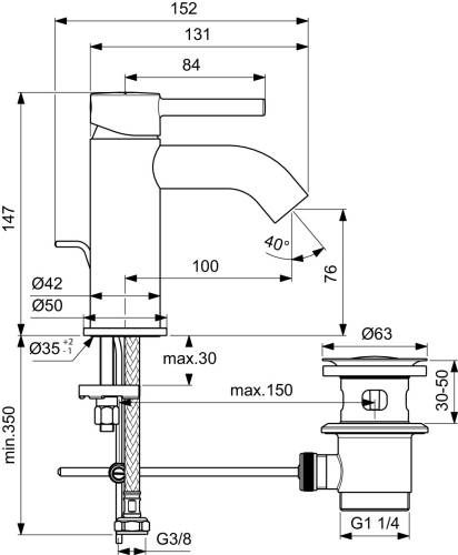 Bec fixe. Aérateur avec limiteur de débit 5 L/min. Cartouche Ø 28 mm avec limiteur de température. Système de fixation rapide Easy-Fix. Tirette et vidage bonde métal. Hauteur sous aérateur 7,6 cm, projection 10 cm, hauteur totale 14,7 cm.