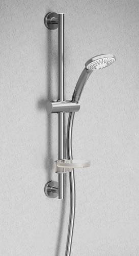 Set de douche composé d'une barre de 60cm, d'une douchette (Ø 100mm, 3 jets (jet pluie, pluie concentrée et massage) et 6l/min), d'un flexible anti-torsion de 1,75m et d'un porte-savon transparent. Nettoyage facile grâce aux picots en silicone anticalcaire.