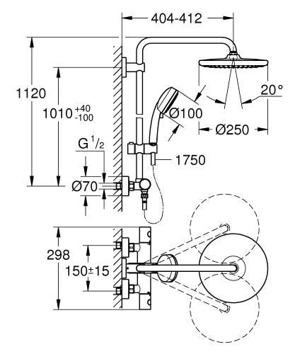 - douche de tête Tempesta 250 (jet pluie, partie supérieure de la douche de tête blanche, avec rotule, angle de rotation ± 10° et économie d’eau débit limité inférieur 9,5L/min)