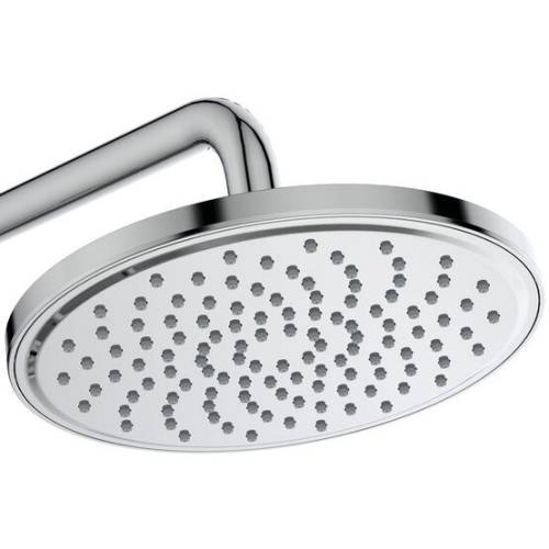 Douche de tête 250 mm. Débit 8 l/min. Douchette 100 mm 3 jets. Flexible anti-torsion 1,75 m. Inverseur dans la poignée, butées à 50 % du débit et à 40°C, corps tiède. Température maximum 50°C. Dimensions : 315x505.5x1117mm.