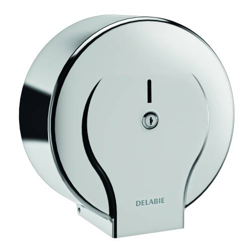 Distributeur de papier toilette mural. Grand modèle pour bobine de 400m. Dévidoir de papier toilette en acier laqué blanc. Couvercle articulé monobloc pour un entretien facile et une meilleure hygiène. Avec fond : protège des imperfections murales, de l'humidité et de la poussière. Avec serrure et clé standard Delabie. Contrôle de niveau. Garantie 10 ans.