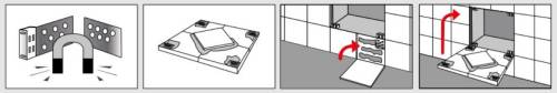 Permet l'adaptation à toutes les dimensions sur chantier. Pose très simple. Ce kit se compose de 4 plaques magnétiques à sceller et 4 platines métalliques.