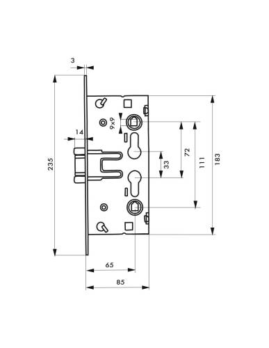 Coffre acier zingué. Têtière acier zingué bouts ronds. Réversible. Pêne acier. Carré 9 mm et entraxe 72 mm. Rappel du 1/2 tour par la clé.