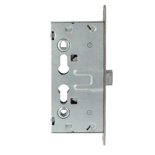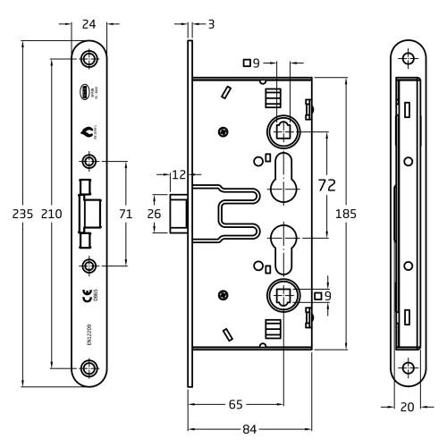 Serrure pour portes coupe feu. Sans fonction anti panique. Avec double carré 9 mm fouillot et double trou de cylindre. Entreaxe: 72 mm. Têtière en acier inox. Sans support et sans cylindre. Pour cylindre europrofil avec panneton longue de 15 mm.