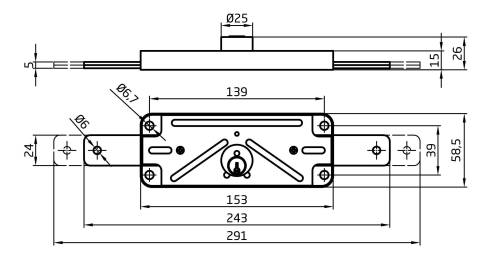 Serrure en métal pour la fermeture de l'obturateur. Actionnement extérieur et intérieur avec clé. Leviers latéraux en acier bichromaté (2 points de fermeture). Déplacement 24 mm avec un tour de clé. Coffre et couvercle en acier zingué. Cylindre rond avec 3 goupilles. Inclus 3 clés en laiton nickelé. Modèle 462/1 et 462/2 avec clés égales. Ébauche de clé modèle 4642.