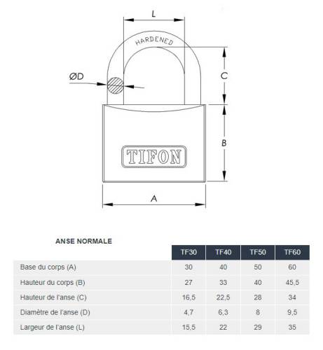 Cadenas corps laiton d'extrusion, double verrouillage. Serrure à 5 goupilles (40 à 60 mm). Anse en acier cémenté et chromé. Ressorts en acier inoxydable AISI 304. Livré avec 2 clés plates.