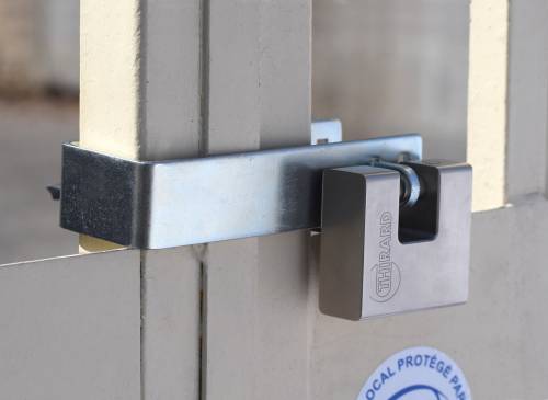 Porte cadenas pour tous types de grilles. Acier cémenté. Verrouillage ajustable. Garantie 10 ans.
