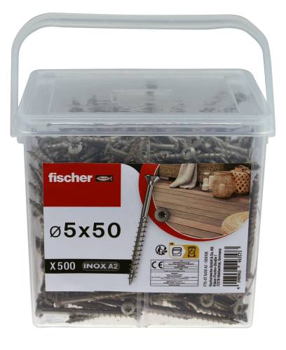 La vis de terrasse fischer avec tête fraisée fine, empreinte étoile TX et filetage partiel est idéale pour le vissage à fleur de la surface, sans éclats, des ossatures de terrasses et des planchers en bois. L'empreinte en étoile TX permet une transmission de la force maximale avec une stabilité maximale de l'embout. La vis de terrasse A2 en acier inoxydable est très résistante aux intempéries et à l'acide tannique. La géométrie fine de la tête permet une finition de surface nette et sans éclats, même avec des fixations proches du bord.