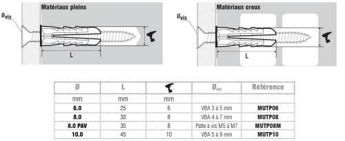 En polypropylène très rigide et incassable. Très bonne tenue dans tous types de murs. Crantage antirotation Ouverture ultra rapide lors de l’expansion. Convient à tous les types de matériaux (béton, maçonnerie pleine et creuse, plâtre et parpaing creux) et fonctionne avec vis, patte à vis, clou...