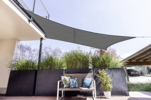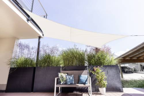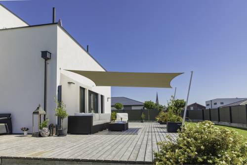 Toile polyester enduit idéale pour ombrager le jardin, la terrasse, le balcon, la piscine ou bien encore le bac à sable de vos enfants. Résistante aux UV, au vent et à l'eau cependant il est conseillé de la retirer en cas de très forte pluie, de tempête ou d'orage. Œillets métalliques pour le fixation. Ourlet périphérique renforcé. Coupe concave pour une tension sans plis. Protection contre les UV 50+. Laver à 30°C ou moins. Ne pas javelliser. Ne pas sécher en machine. Ne pas nettoyer à sec. Peut être repasser. Tissu 180g/m². Respecter une pente de 15° (environ 15cm par mètre) pour l'évacuation des eaux de pluie.