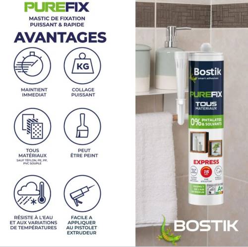 Le mastic de fixation hybride Purefix Express de Bostik est un mastic super puissant et rapide. Fixe 100% des matériaux (bois, pierre, béton,métal, brique, parpaing, plastique rigide, carrelage... sauf Téflon, PE, PP, PVC souple) en intérieur et extérieur. Maintien immédiat et collage ultra-puissant. Sèche en 15 minutes. Résiste à l'eau et aux variations de température (-30°C à +90°C). Résiste aux chocs. Sans odeur. O% phtalates / 0% solvants.