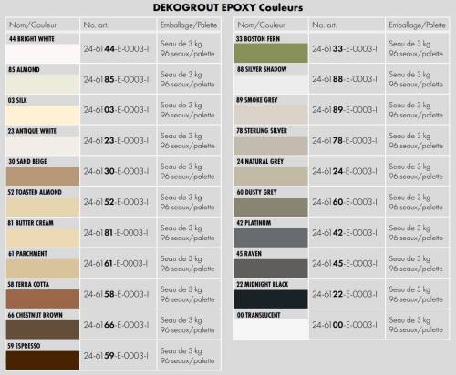 Joint-adhesif bi-composant hydrofuge, anti-tache, anti-moisissure, antibacterien, anti-acide. Excellente finition, facile à appliquer, faible consommation. Antibactérien et résistant à la moisissure. Parfait pour des carreaux rectifiés. Hydrofuge. Résistant aux cycles de gel-dégel. Facile à appliquer et à nettoyer. Surface lisse et large gamme de couleurs (24 couleurs). Résistant aux sollicitations mécaniques et chimiques. Pour l’intérieur, l’extérieur et immersion continue. Pour joints de 1 à 10mm de largeur. Indiqué pour sols et murs chauffants. Couleurs assorties à celles du système de joint silicone DEKOSIL. Satisfait les qualités requises par les Normes EN 13888 RG et EN 12004 R2T.